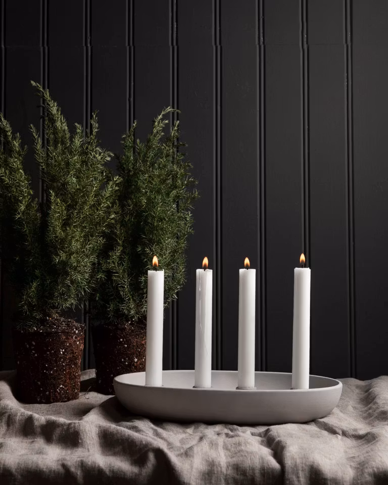 Ljushållare i keramik för fyra kronljus på rad. Fyll denna fina ljusstake med mossa eller nötter till vintern. Passar fint till julens alla dukningar på matbordet och skapar en mysig stäming under årets mörka dagar.
